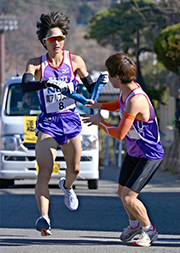 南都留の5区志村竜星(左、区間1位)から6区小山田雄登(区間4位)にたすきをつなぐ=甲州市内 |