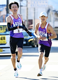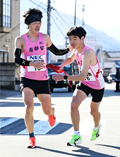 南アルプスAの15区井上貴博(左、区間2位)から16区清水颯(区間1位)にたすきが渡る