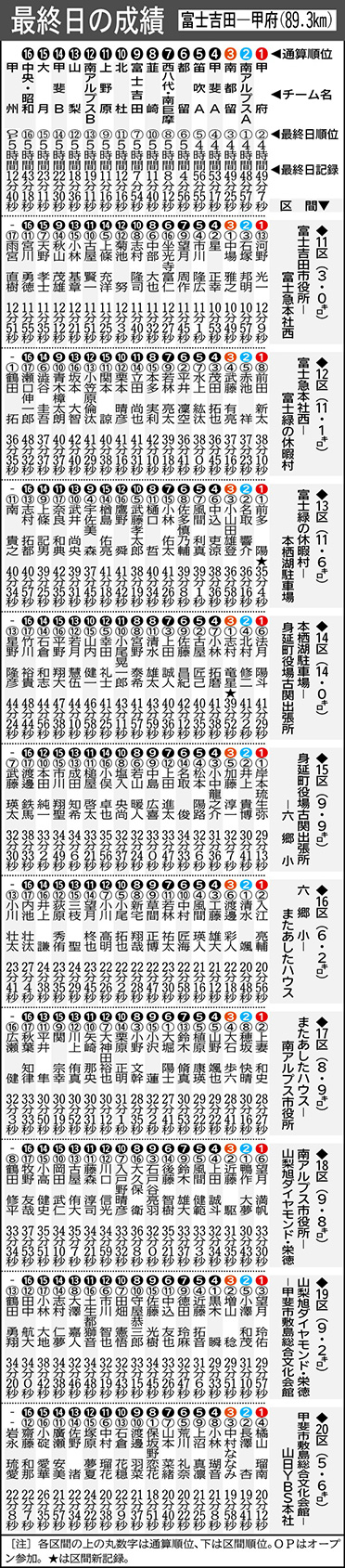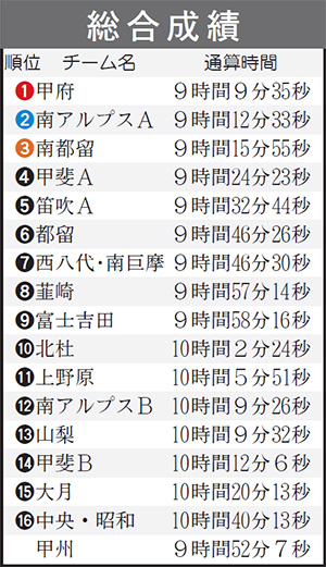午前8時に17チームが富士吉田市役所を一斉にスタート。初日に3分8秒のリードを奪い首位に立っていた甲府は12区で南アルプスAに1分9秒差まで詰め寄られたが、13区の前多陽(山梨学院高)が区間新をマーク。再び2分以上のリードを奪い、逃げ切った。